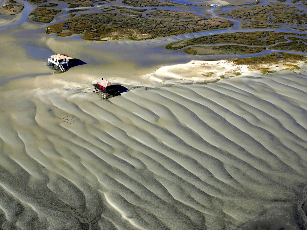 Il existe deux cabanes tchanquées sur l'île aux Oiseaux, petite île située au centre du Bassin d'Arcachon.